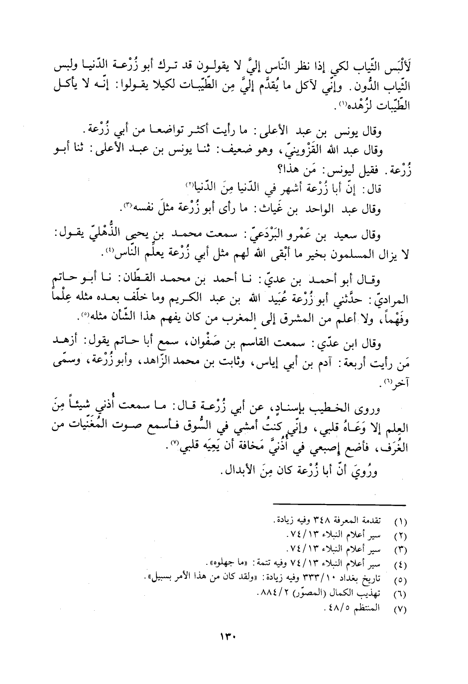 لَألْبَس الثّياب لكي إذا نظر النّاس إليّ لا يقولون قد ترك أبو زُرْعة الدُّنيا ولبس الثياب الدُّون. وإنّي لآكل ما يُقدَّم إليّ من الطّيّبات لكيلا يقولوا: إنّه لا يأكل الطّيّبات لزُهْده [1] .