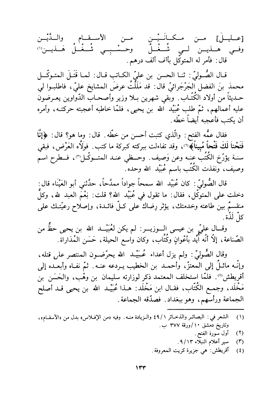 فقال عمُّه الفتح: وَالَّذِي كتبت أحسن من خطّه. قَالَ: وما هُوَ؟ قَالَ: إِنَّا فَتَحْنا لَكَ فَتْحاً مُبِيناً 48: 1 [2] ، وقد تفاءلت ببركته كبركة ما كتب. فولَّاه العَرْض، فبقي سنة يؤرّخ الكُتُب عَنْهُ وعن وَصيف. وحظى عند المتوكل [3] ، فطرح اسم وصيف، ونفذت الكُتُب باسم عُبَيْد الله وحده.