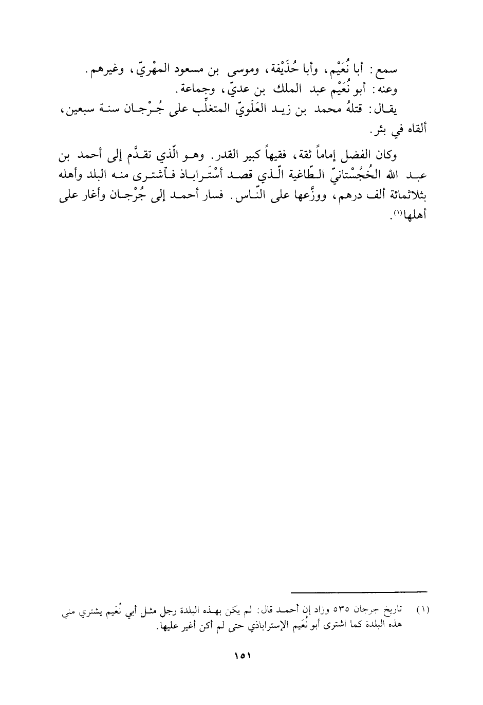 [1] تاريخ جرجان 535 وزاد إن أحمد قال: لم يكن بهذه البلدة رجل مثل أبي نعيم يشتري مني هذه البلدة كما اشترى أبو نعيم الأستراباذي حتى لم أكن أغير عليها.