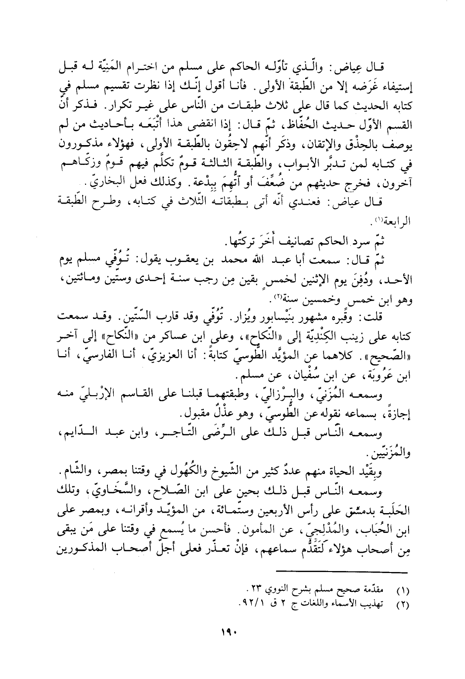 قَالَ عِياض: وَالَّذِي تأوّله الحاكم على مُسْلِم من اخترام المَنِيّة له قبل استيفاء غَرَضه إلّا من الطبقة الأولى. فأنا أقول إنّك إذا نظرت تقسيم مُسْلِم فِي كتابه الحديث كما قَالَ على ثلاث طبقات من النّاس على غير تكرار. فذكر أنّ القسم الأول حديث الحُفّاظ، ثُمَّ قَالَ: إذا انقضى هَذَا أتْبَعَه بأحاديث من لم يوصف بالحِذْق والإتقان، وذكر أنّهم لاحقون بالطبقة الأولى، فهؤلاء مذكورون فِي كتابه لمن تدبَّر الأبواب، والطبقة الثالثة قومٌ تكلَّم فيهم قومٌ وزكّاهم آخرون، فخرج حديثهم من ضُعِّف أو اتُّهِمَ بِبِدْعة. وكذلك فعل الْبُخَارِيّ.