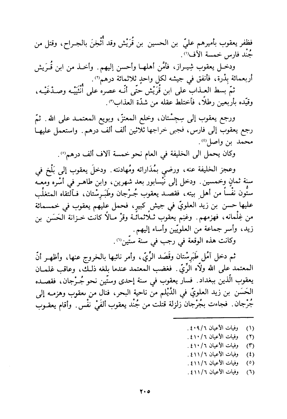 فظفر يعقوب بأميرهم عليّ بْن الْحُسَيْن بْن قُرَيْش وقد أُثْخِنَ بالجراح، وقتل من جُنْد فارس خمسة آلاف [1] .