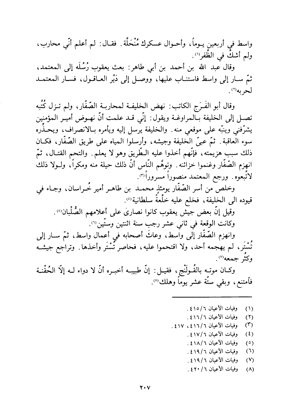 وقَالَ أبو الفَرَج الكاتب: نهض الخليفة لمحاربة الصّفّار، ولم تزل كُتُبه تصل إِلَى الخليفة بالمراوغة ويقول: إنّي قد علمت أنّ نهوض أمير المؤمنين يشرّفني وينبّه على موقعي منه. والخليفة يرسل إليه ويأمره بالانصراف، ويحذّره سوء العاقبة. ثمّ عبّأ الخليفة وجيشه، وأرسلوا المياه على طريق الصّفّار، فكان ذلك سبب هزيمته، فإنّهم أخذوا عليه الطّريق وهو لا يعلم. والتحم القتال، ثُمَّ انهزم الصّفّار وغنموا خزائنه. وتوهَّم النّاس أنّ ذلك حيلة منه ومكرًا، ولولا ذلك لاتّبعوه. ورجع المعتمد منصورًا مسرورًا [3] .