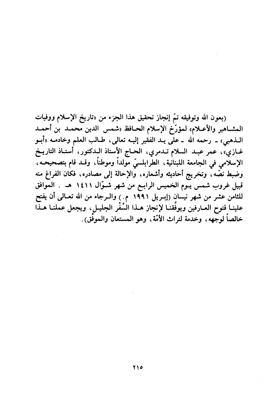 (بعون الله وتوفيقه تمّ إنجاز تحقيق هذا الجزء من «تاريخ الإسلام ووفيات المشاهير والأعلام» لمؤرّخ الإسلام الحافظ «شمس الدين محمد بن أحمد الذهبي» - رحمه الله- على يد الفقير إليه تعالى، طالب العلم وخادمه «أبو غازي» ، عمر عبد السلام تدمري، الحاج الأستاذ الدكتور، أستاذ التاريخ الإسلامي في الجامعة اللبنانية، الطرابلسيّ مولدا وموطنا، وقد قام بتصحيحه، وضبط نصّه، وتخريج أحاديثه وأشعاره، والإحالة إلى مصادره، فكان الفراغ منه قبيل غروب شمس يوم الخميس الرابع من شهر شوّال 1411 هـ. الموافق للثامن عشر من شهر نيسان (أبريل 1991 م.) والرجاء من الله تعالى أن يفتح علينا فتوح العارفين ويوفّقنا لإنجاز هذا السّفر الجليل، ويجعل عملنا هذا خالصا لوجهه، وخدمة لتراث الأمّة، وهو المستعان والموفّق) .