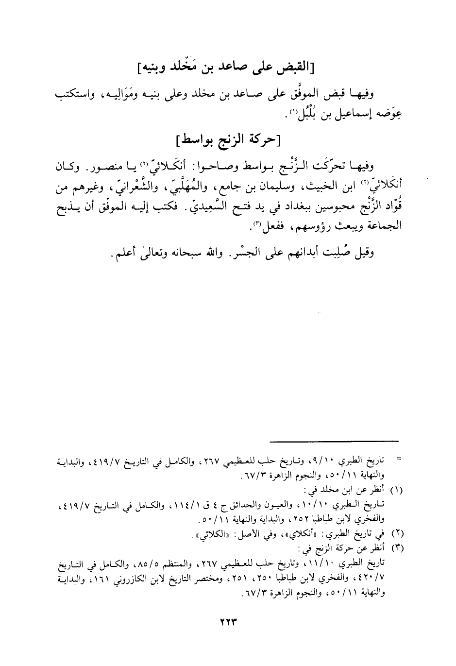 [ () ] تاريخ الطبري 10/ 9، وتاريخ حلب للعظيميّ 267، والكامل في التاريخ 7/ 419، والبداية والنهاية 11/ 50، والنجوم الزاهرة 3/ 67.