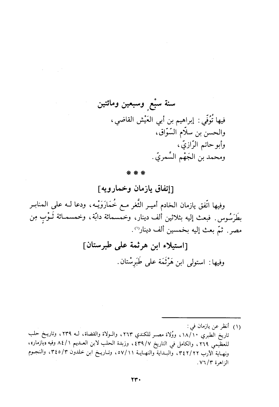 تاريخ الطبري 10/ 18، وولاة مصر للكندي 263، والولاة والقضاة، له 239، وتاريخ حلب للعظيميّ 269، والكامل في التاريخ 7/ 439، وزبدة الحلب لابن العديم 1/ 84 وفيه «يازمار» ، ونهاية الأرب 22/ 342، والبداية والنهاية 11/ 57، وتاريخ ابن خلدون 3/ 345، والنجوم الزاهرة 3/ 76.