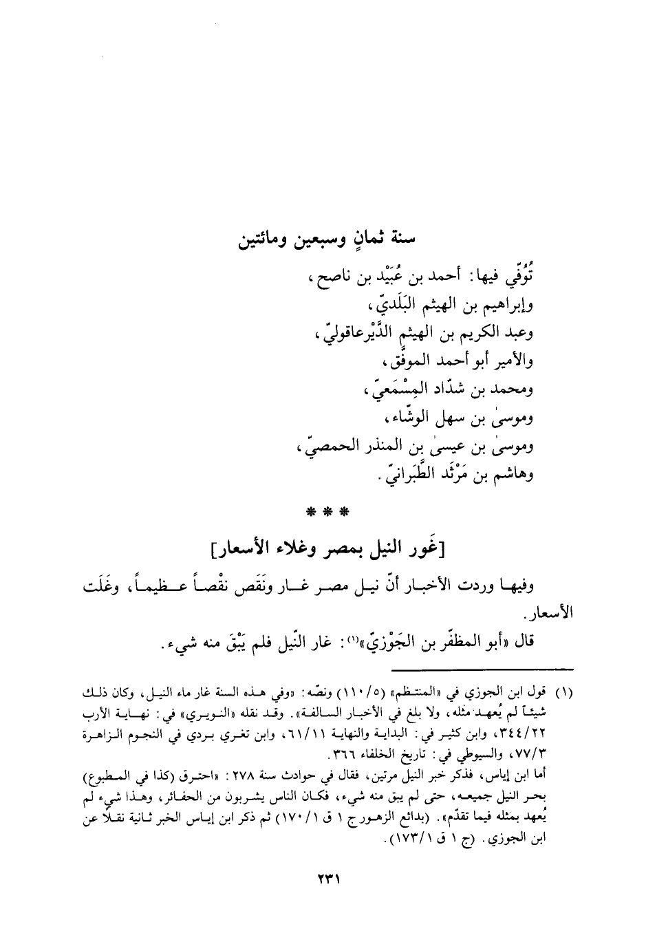[1] قول ابن الجوزي في «المنتظم» (5/ 110) ونصّه: «وفي هذه السنة غار ماء النيل، وكان ذلك شيئا لم يعهد مثله، ولا بلغ في الأخبار السالفة» . وقد نقله «النويري» في: نهاية الأرب 22/ 344، وابن كثير في: البداية والنهاية 11/ 61، وابن تغري بردي في النجوم الزاهرة 3/ 77، والسيوطي في: تاريخ الخلفاء 366.