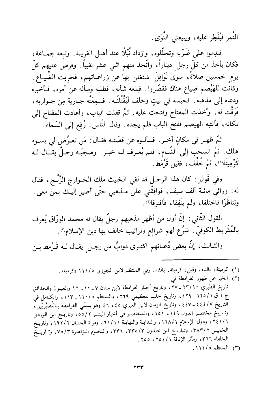 والثالث، إنّ بعض دعاتهم اكترى دواب من رَجُل يقال له قرمط بن