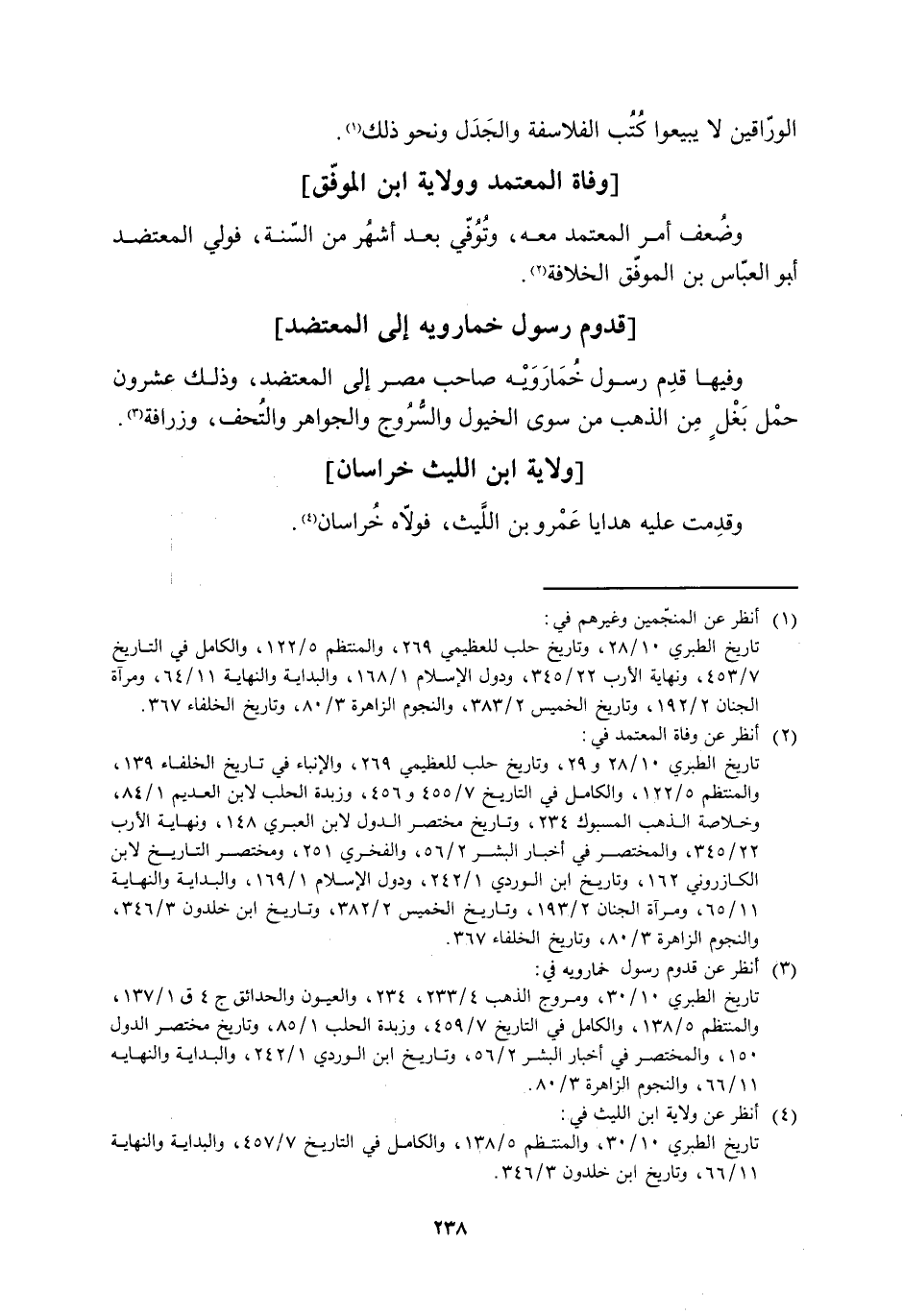 تاريخ الطبري 10/ 30، ومروج الذهب 4/ 233، 234، والعيون والحدائق ج 4 ق 1/ 137، والمنتظم 5/ 138، والكامل في التاريخ 7/ 459، وزبدة الحلب 1/ 85، وتاريخ مختصر الدول 150، والمختصر في أخبار البشر 2/ 56، وتاريخ ابن الوردي 1/ 242، والبداية والنهاية 11/ 66، والنجوم الزاهرة 3/ 80.
