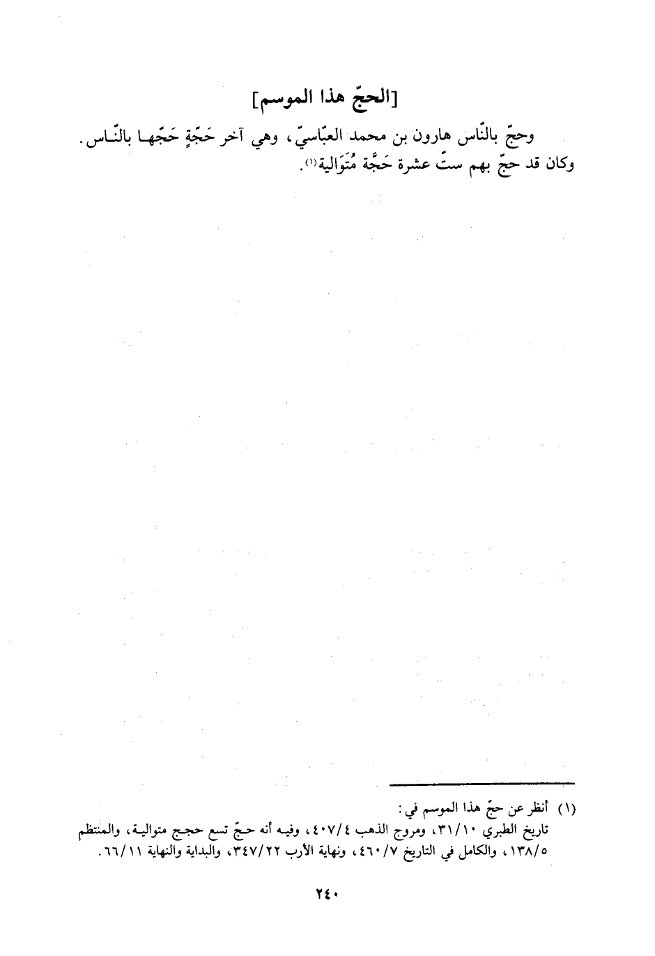 تاريخ الطبري 10/ 31، ومروج الذهب 4/ 407، وفيه أنه حجّ تسع حجج متوالية، والمنتظم 5/ 138، والكامل في التاريخ 7/ 460، ونهاية الأرب 22/ 347، والبداية والنهاية 11/ 66.