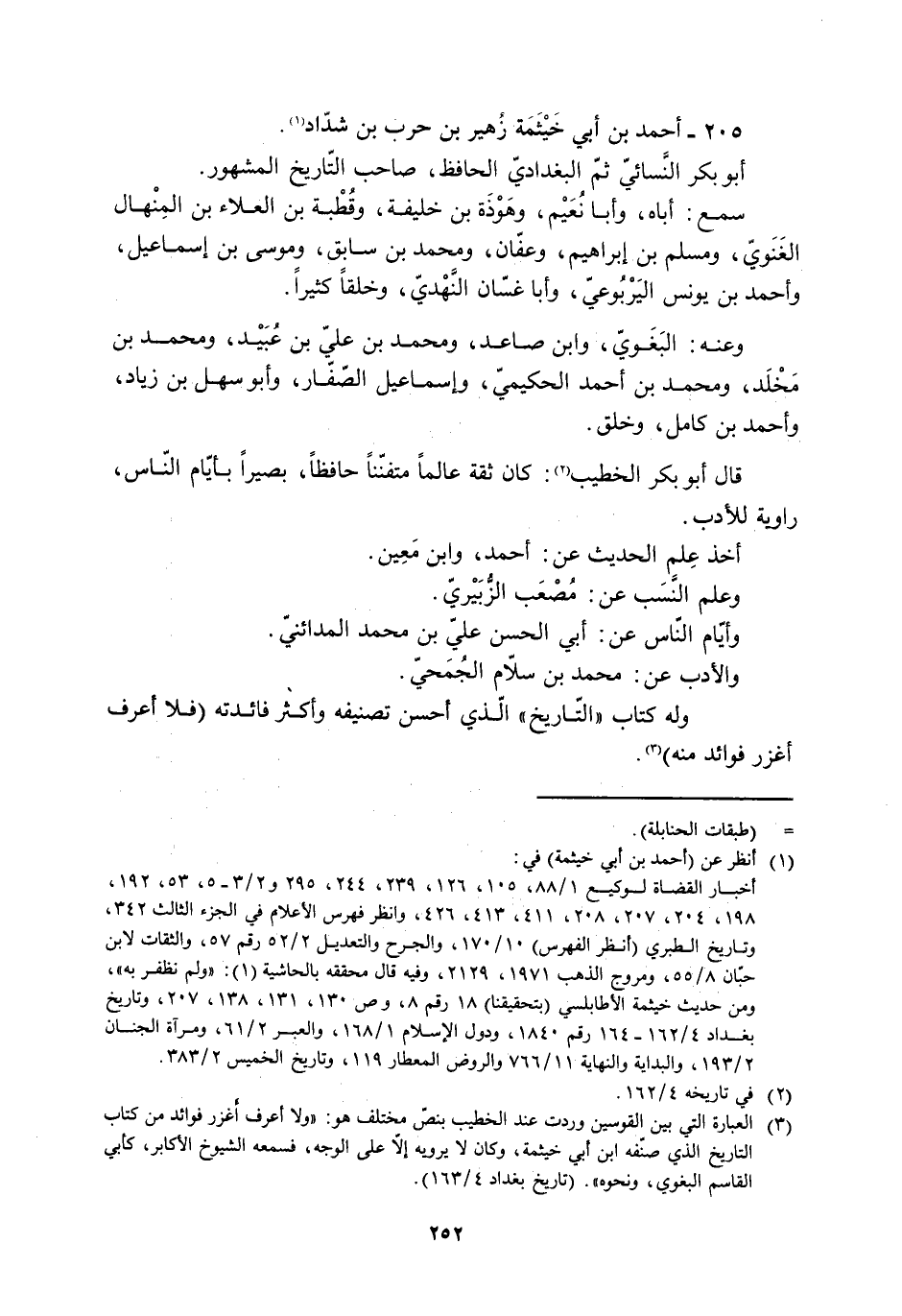 [3] العبارة التي بين القوسين وردت عند الخطيب بنصّ مختلف هو: «ولا أعرف أغزر فوائد من كتاب التاريخ الّذي صنّفه ابن أبي خيثمة، وكان لا يرويه إلّا على الوجه، فسمعه الشيوخ الأكابر، كأبي القاسم البغوي، ونحوه» . (تاريخ بغداد 4/ 163) .