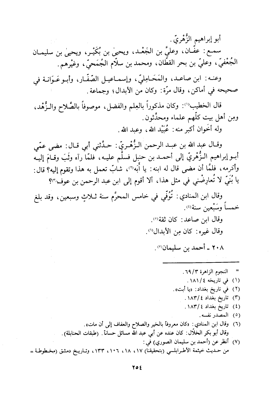 وقَالَ عَبْد الله بْن عَبْد الرَّحْمَن الزُّهْريّ: حدَّثني أبي قَالَ: مضى عمي أبو إِبْرَاهِيم الزُّهْرِيّ إِلَى أَحْمَد بْن حنبل فسلَّم عليه، فَلَمَّا رآه وثب وقام إليه وأكرمه، فَلَمَّا أن مضى قَالَ له ابنه: يا أبه [2] ، شاب تعمل به هَذَا وتقوم إليه؟ قَالَ: