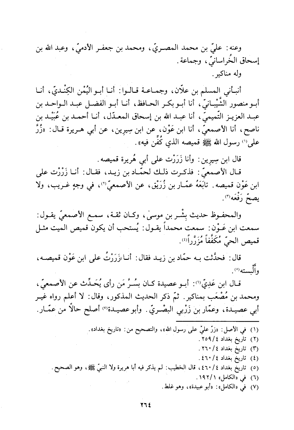 أَنْبَأَنِي الْمُسْلِمُ بْنُ عِلانَ، وجماعة قَالُوا: أَنَا أَبُو الْيُمْنِ الْكِنْدِيُّ، أَنَا أَبُو مَنْصُورٍ الشَّيْبَانِيُّ، أَنَا أَبُو بَكْرٍ الْحَافِظُ، أَنَا أَبُو الْفَضْلِ عَبْدُ الْوَاحِدِ بْنُ عَبْدِ الْعَزِيزِ التَّمِيمِيُّ، أَنَا عَبْدُ اللَّهِ بْنُ إِسْحَاقَ الْمُعَدَّلُ، أَنَا أَحْمَدُ بْنُ عُبَيْدِ بْنِ نَاصِحٍ، أَنَا الأَصْمَعِيُّ، أَنَا ابْنُ عَوْنٍ، عَنِ ابْنِ سِيرِينَ، عَنْ أَبِي هُرَيْرَةَ قَالَ: «زُرَّ عَلَى [1] رَسُولِ اللَّهِ صَلَّى اللَّهُ عَلَيْهِ وَسَلَّمَ قَمِيصُهُ الَّذِي كُفِّنَ فِيهِ» .