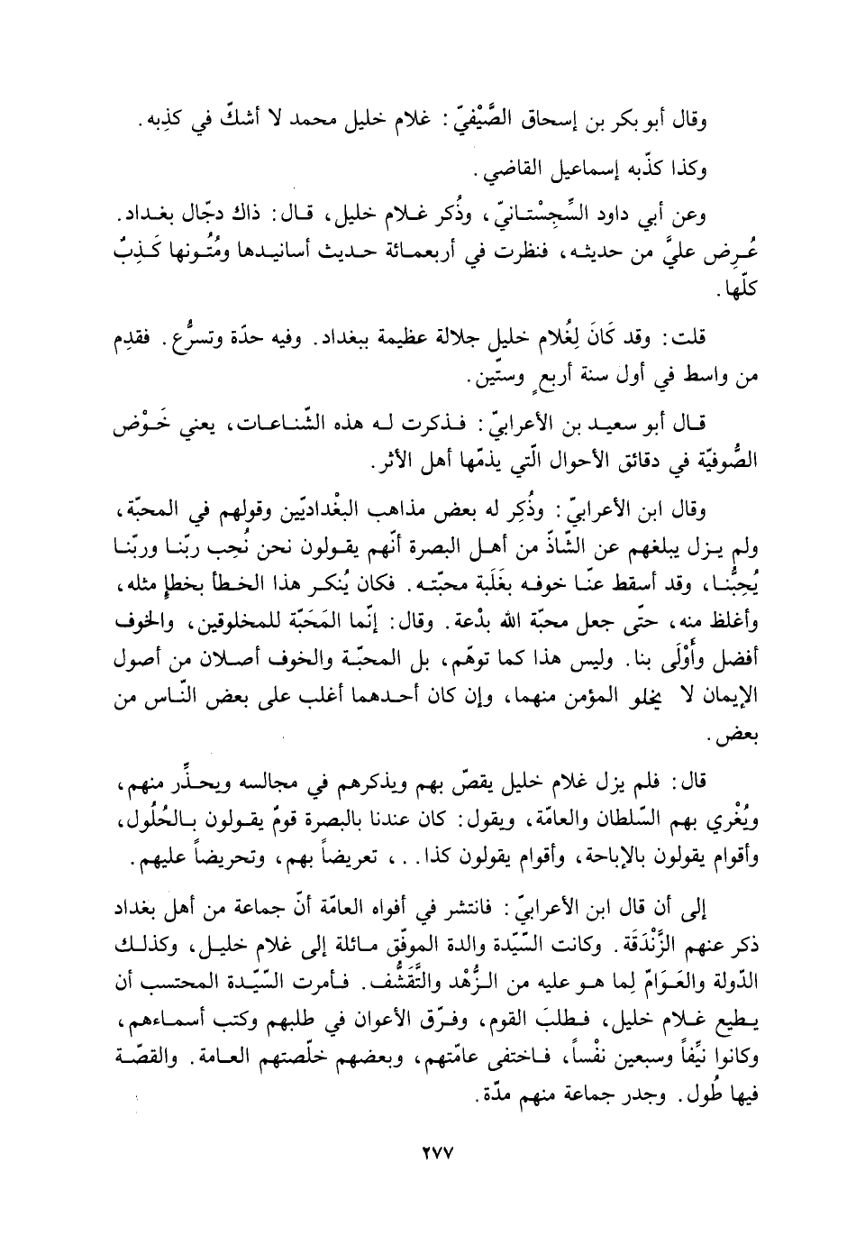 إِلَى أن قَالَ ابنُ الأعرابي: فانتشر فِي أفواه العامة أنّ جماعة من أَهْل بغداد ذكر عَنْهُمُ الزندقة. وكانت السيدة والدة الموفَّق مائلة إِلَى غلام خليل، وكذلك الدولة والعوام لِما هُوَ عليه من الزهد والتقشف. فأمرت السيدة المحتسب أن يطيع غلام خليل، فطلب القوم، وفرق الأعوان فِي طلبهم وكتب أسماءهم، وكانوا نيفًا وسبعين نفسًا، فاختفى عامتهم، وبعضهم خلصتهم العامة. والقصة فيها طول. وجدر جماعة منهم مدة.