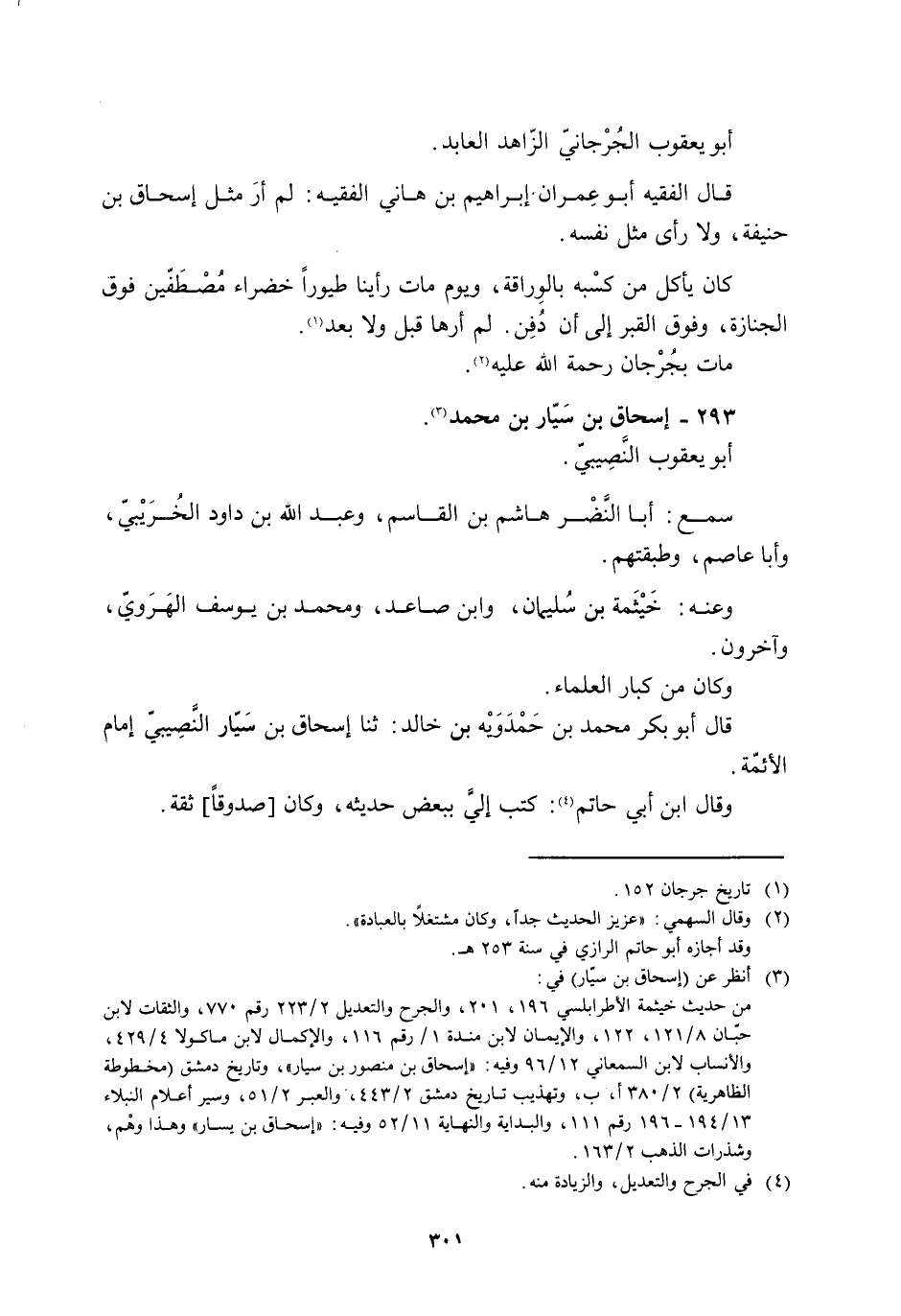 من حديث خيثمة الأطرابلسي 196، 201، والجرح والتعديل 2/ 223 رقم 770، والثقات لابن حبّان 8/ 121، 122، والإيمان لابن مندة 1/ رقم 116، والإكمال لابن ماكولا 4/ 429، والأنساب لابن السمعاني 12/ 96 وفيه: «إسحاق بن منصور بن سيار» ، وتاريخ دمشق (مخطوطة الظاهرية) 2/ 380 أ، ب، وتهذيب تاريخ دمشق 2/ 443، والعبر 2/ 51، وسير أعلام النبلاء 13/ 194- 196 رقم 111، والبداية والنهاية 11/ 52 وفيه: «إسحاق بن يسار» وهذا وهم، وشذرات الذهب 2/ 163.