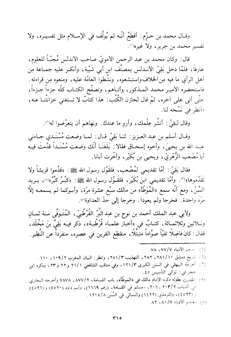 ولأبي عبد الملك أَحْمَد بْن نوح بْن عَبْد البر القرطبيّ، المتوفّى سنة ثمان وثلاثين وثلاثمائة، كتاب فِي «أخبار علماء قرطبة» ، ذكر فِيهِ بقيّ بْن مخلد، فقال: كان فاضلًا تقيًّا صواما متبتلا، منقطع القرين فِي عصره، منفردًا عن النّظير.