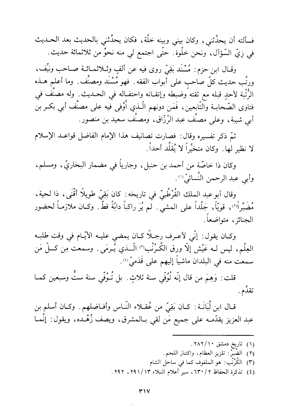 وقَالَ أبو عَبْد الملك القرطبي في تاريخه: كان بقيّ طويلًا أقْنى، ذا لحية، مضبرًا [2] ، قويًّا، جلدًا على المشي. لم ير راكبًا دابة قط. وكان ملازمًا لحضور الجنائز، متواضعًا.