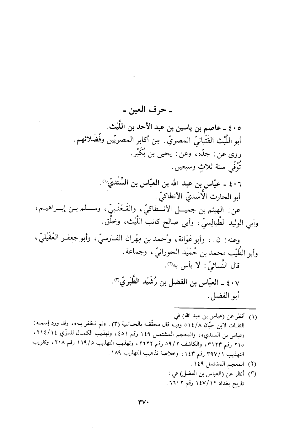 «عباس بن السندي» ، والمعجم المشتمل 149 رقم 451، وتهذيب الكمال للمزّي 14/ 214، 215 رقم 3123، والكاشف 2/ 59 رقم 2622، وتهذيب التهذيب 5/ 119 رقم 208، وتقريب التهذيب 1/ 397 رقم 143، وخلاصة تذهيب التهذيب 189.