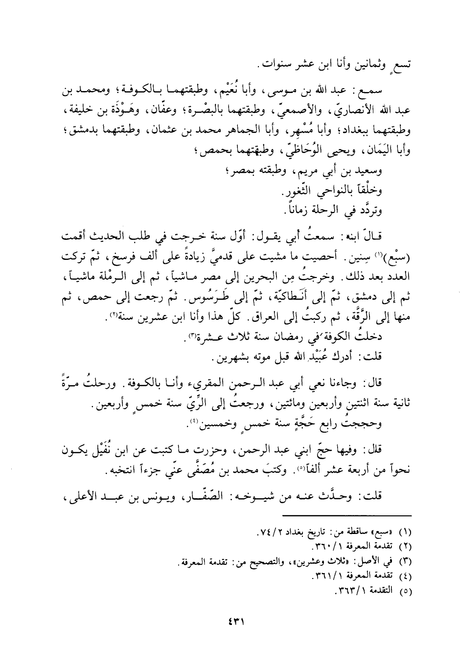 قَالَ ابنه: سمعتُ أبي يقول: أول سنة خرجت فِي طلب الحديث أقمت (سبْع) [1] سنين. أحصيت ما مشيت على قدميّ زيادةً على ألف فرسخ، ثُمَّ تركت العدد بعد ذلك. وخرجت من البحرين إِلَى مصر ماشيًا، ثُمَّ إِلَى الرْملة ماشيًا، ثُمَّ إِلَى دمشق، ثُمَّ إِلَى أنطاكية، ثُمَّ إِلَى طَرَسُوس. ثُمَّ رجعت إِلَى حمص، ثُمَّ منها إِلَى الرَّقَّةِ، ثُمَّ ركبتُ إِلَى العراق. كلّ هَذَا وأنا ابنُ عشرين سنة [2] .
