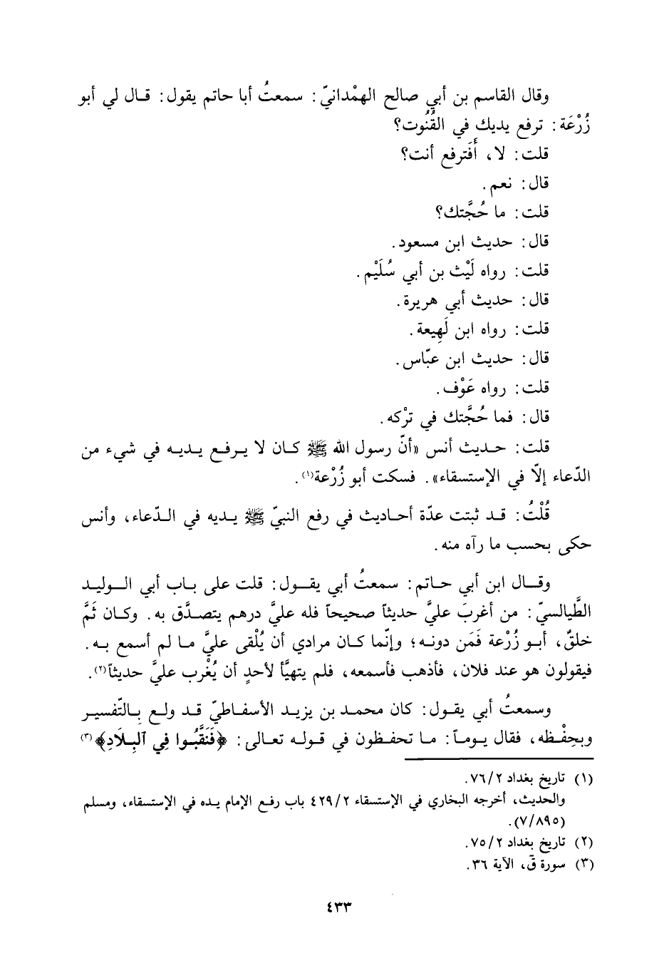 وَقَالَ الْقَاسِمُ بْنُ أَبِي صَالِحٍ الْهَمْدَانِيُّ: سَمِعْتُ أَبَا حَاتِمٍ يَقُولُ: قَالَ لِي أَبُو زُرْعَةَ: تَرْفَعُ يَدَيْكَ فِي الْقُنُوتِ؟