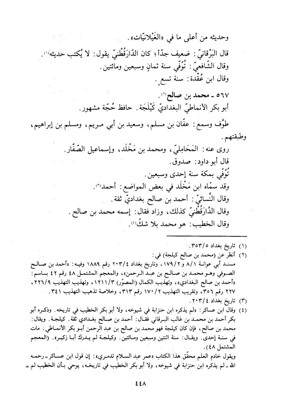 محمد بن صالح، فإن كان كيلجة فهو محمد بن صالح بن عبد الرحمن أبو بكر الأنماطي. مات في سنة إحدى. ويقال: سنة اثنتين وسبعين ومائتين. وكيلجة لم يدرك أبا زكير» . (المعجم المشتمل 48) .