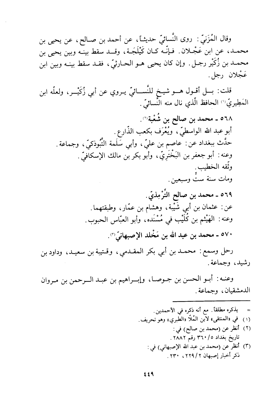 قلت: بل أقول هو شيخ للنّسائيّ يروي عن أبي زُكَيْر، ولعلّه ابنُ المطيري [1] الحافظ الَّذِي نال منه النَّسائيّ.