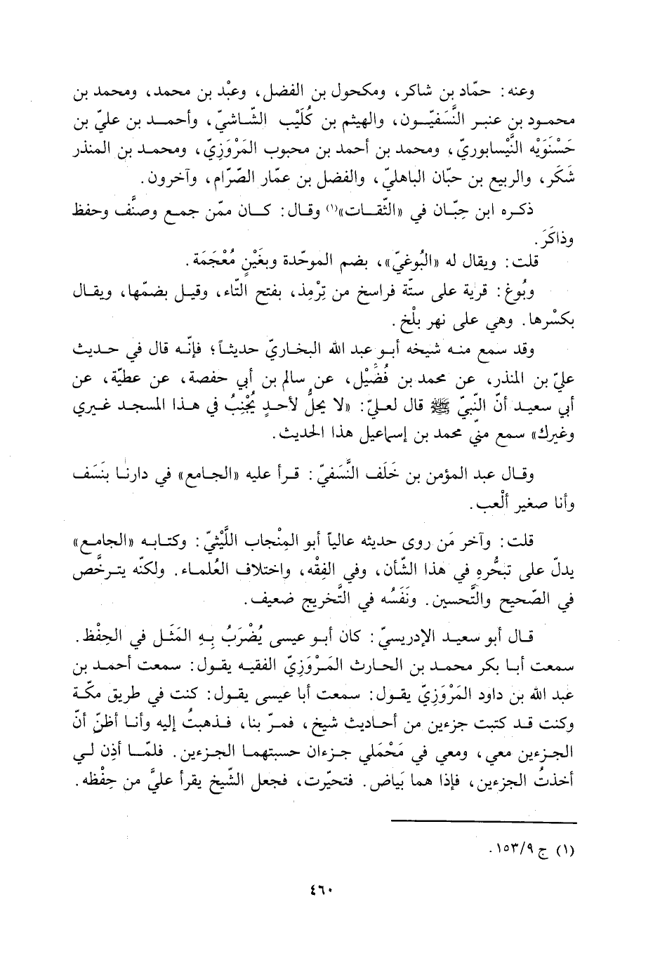 قلت: وآخر من روى حديثه عاليًا أبو المِنْجاب اللَّيْثيّ: وكتابه «الجامع» يدلّ على تبحُّرهِ فِي هَذَا الشأن، وَفِي الفقه، واختلاف العلماء. ولكنّه يترخَّص فِي الصّحيح والتَّحسين. ونَفَسُه فِي التخريج ضعيف.