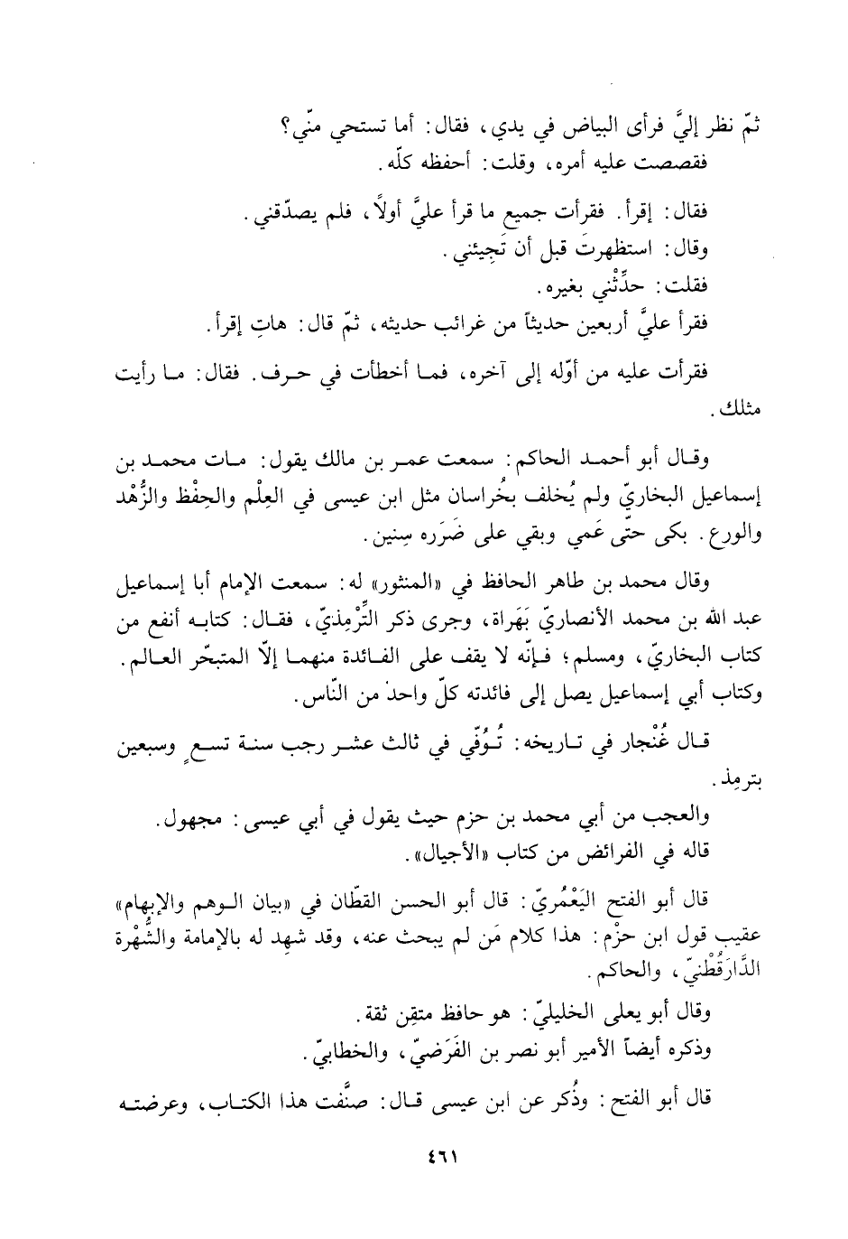 قَالَ أبو الفتح اليَعْمُريّ: قَالَ أبو الْحَسَن القطّان فِي «بيان الوهم والإبهام» عقيب قول ابنِ حزْم: هَذَا كلام من لم يبحث عَنْهُ، وقد شهِدَ له بالإمامة والشّهرة الدّار الدّارَقُطْنِيّ، والحاكم.