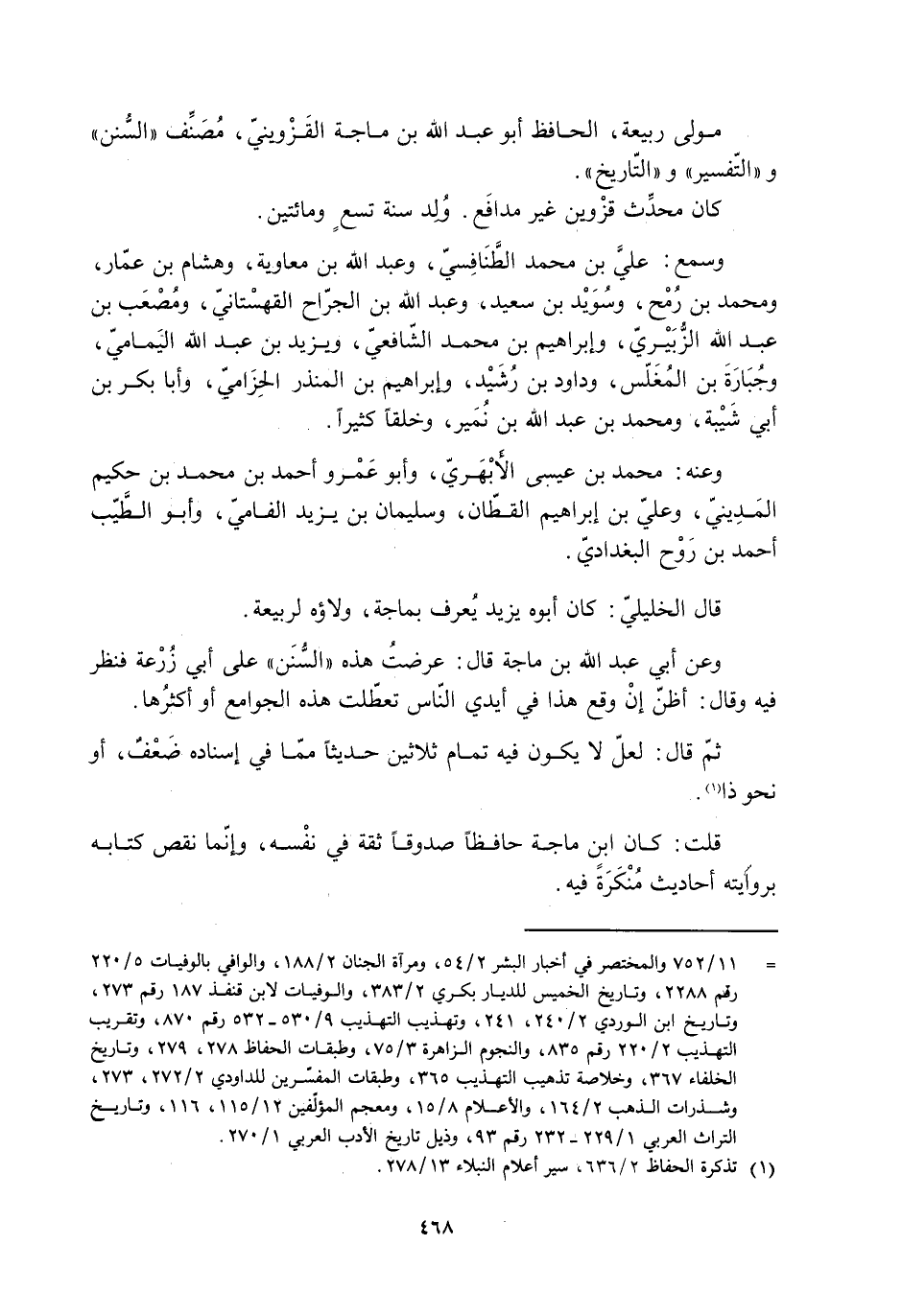 قلت: كان ابنُ ماجة حافظًا صدوقًا ثقة فِي نفْسه، وإنّما نقص كتابه بروايته أحاديث منكرة فيه.