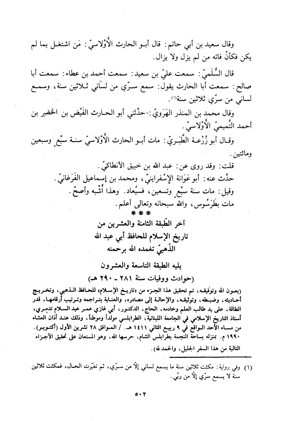 آخر الطّبقة الثامنة والعشرين من تاريخ الإسلام للحافظ أبي عبد الله الذّهبيّ تغمده الله برحمته يليه الطبقة التاسعة والعشرون (حوادث ووفيات سنة 281- 290 هـ) (بعون الله وتوفيقه، تم تحقيق هذا الجزء من «تاريخ الإسلام» للحافظ الذهبي، وتخريج أحاديثه، وضبطه، وتوثيقه، والإحالة إلى مصادره، والعناية بتراجمه وترتيب أرقامها، قدر الطاقة، على يد طالب العلم وخادمه، الحاج، الدكتور، أبي غازي عمر عبد السلام تدمري، أستاذ التاريخ الإسلامي في الجامعة اللبنانية، الطرابلسي مولدا وموطنا، وذلك عند أذان العشاء من مساء الأحد الواقع في 9 ربيع الثاني 1411 هـ. / الموافق 28 تشرين الأول (أكتوبر) 1990 م. بمنزله بساحة النجمة بطرابلس الشام، حرسها الله، وهو المستعان على تحقيق الأجزاء التالية من هذا السفر الجليل، والحمد للَّه) .