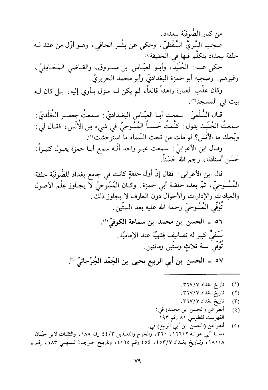 قَالَ ابنُ الأعرابي: فقال إنّ أول حلقةٍ كَانَتْ فِي جامع بغداد للصُّوفيّة حلقة المُسُوحيّ، ثُمَّ بعده حلقة أبي حَمْزَةَ. وكان المُسُوحي لا يجاوز عِلْم الأصول والعبادات والإدارات والأحوال دون العارف لا يجاوز ذلك.