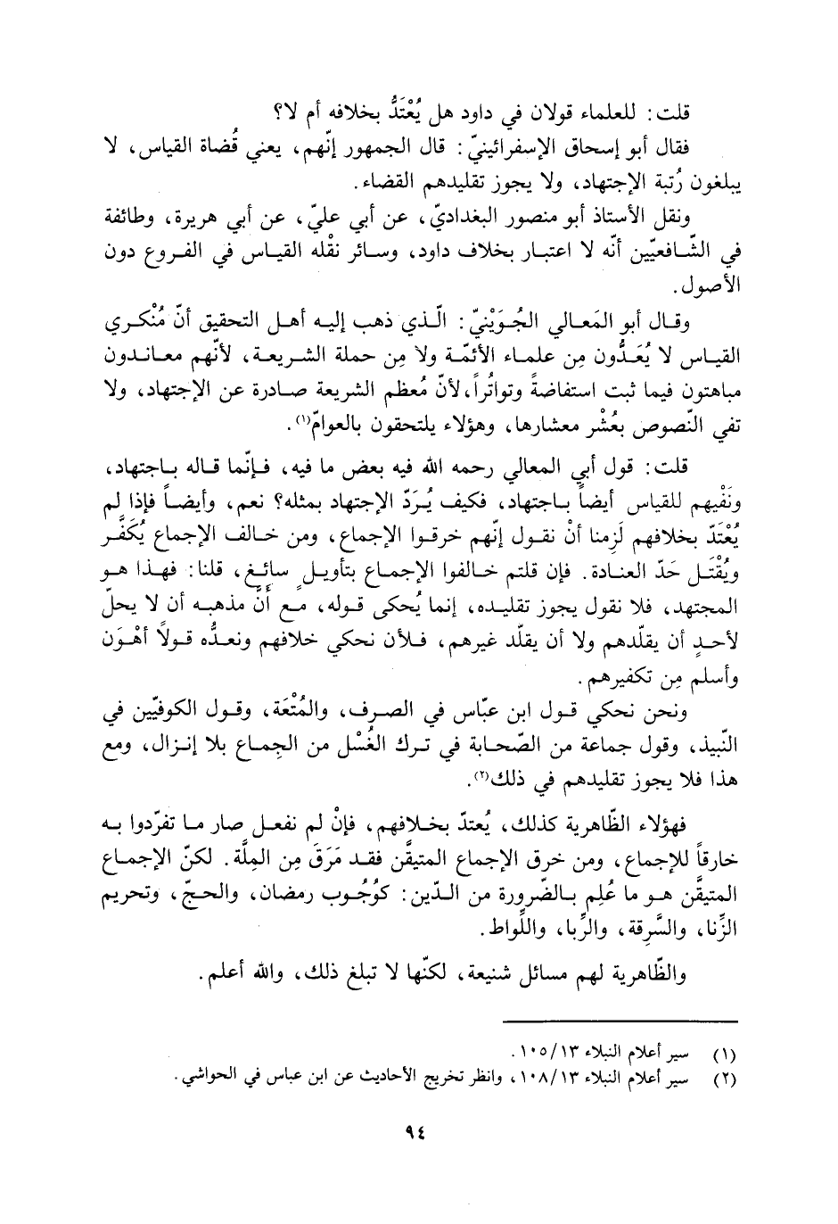 قلت: قول أبي المعالي رحمه الله فِيهِ بعض ما فِيهِ، فإنّما قاله باجتهاد، ونَفْيهم للقياس أيضًا باجتهاد، فكيف يُرَدّ الاجتهاد بِمِثْلِهِ؟ نعم، وأيضًا فإذا لم يُعْتَدّ بخلافهم لَزِمنا أنْ نقول إنّهم خرقوا الإجماع، ومن خالف الإجماع يُكَفَّر وَيُقْتَل حدّ العنادة. فَإِن قلتم خالفوا الإجماع بتأويل سائغ، قُلْنَا: فهذا هُوَ المجتهد، فلا نقول يجوز تقليده، إنما يُحكى قوله، مع أَنّ مذهبه أن لا يحلّ لأحدٍ أن يقلّدهم ولا أن يقلّد غيرهم، فلأن نحكي خلافهم ونعدُّه قولًا أهْوَن وأسلم من تكفيرهم.
