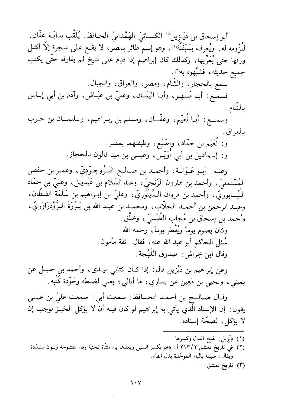وعن إِبْرَاهِيم بن ديْزيل قَالَ: إِذَا كان كتابي بيدي، وأحمد بن حَنْبَلٍ عن يميني، وَيَحْيَى بن معين عن يساري، ما أبالي، يعني لضبطه وجودة كُتُبه.