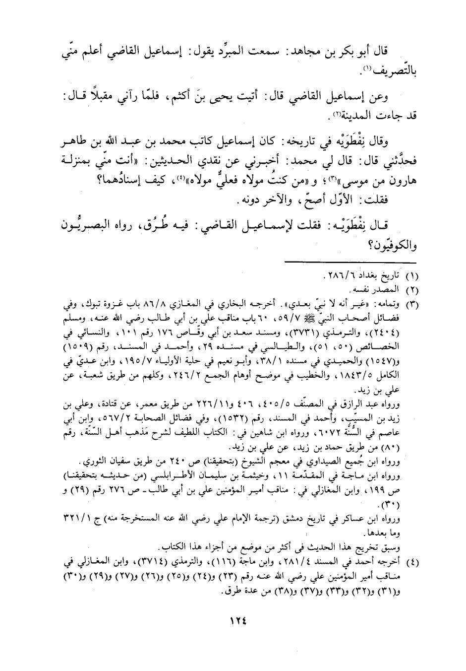 وَقَالَ نِفْطَوَيْهِ فِي تَارِيخِهِ: كَانَ إسْمَاعِيلُ كَاتِبَ محمد بْنِ عَبْدِ اللَّهِ بْنِ طَاهِرٍ فَحَدَّثَنِي قَالَ: قَالَ لِي محمد: أَخْبِرْنِي عَنْ نَقْدِي الْحَدِيثَيْنِ: «أَنْتَ مِنِّي بِمَنْزِلَةِ هَارُونَ مِنْ مُوسَى» [3] ، و «من كُنْتُ مَوْلَاهُ فَعَلِيٌّ مَوْلَاهُ» [4] ، كَيْفَ إِسْنَادُهُمَا؟