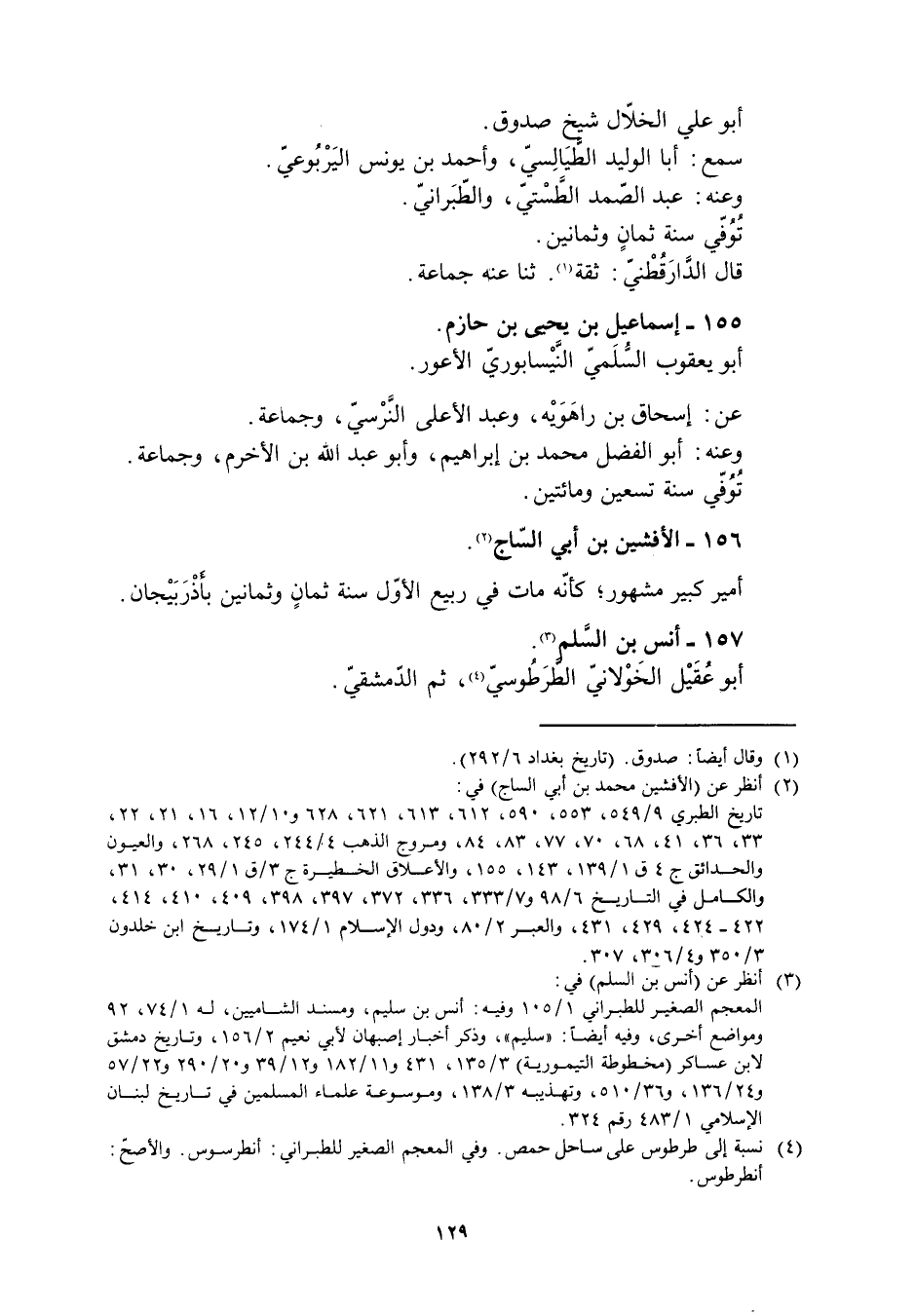 المعجم الصغير للطبراني 1/ 105 وفيه: أنس بن سليم، ومسند الشاميين، له 1/ 74، 92 ومواضع أخرى، وفيه أيضا: «سليم» ، وذكر أخبار أصبهان لأبي نعيم 2/ 156، وتاريخ دمشق لابن عساكر (مخطوطة التيمورية) 3/ 135، 431 و 11/ 182 و 12/ 39 و 20/ 290 و 22/ 57 و 24/ 136، و 36/ 510، وتهذيبه 3/ 138، وموسوعة علماء المسلمين في تاريخ لبنان الإسلامي 1/ 483 رقم 324.