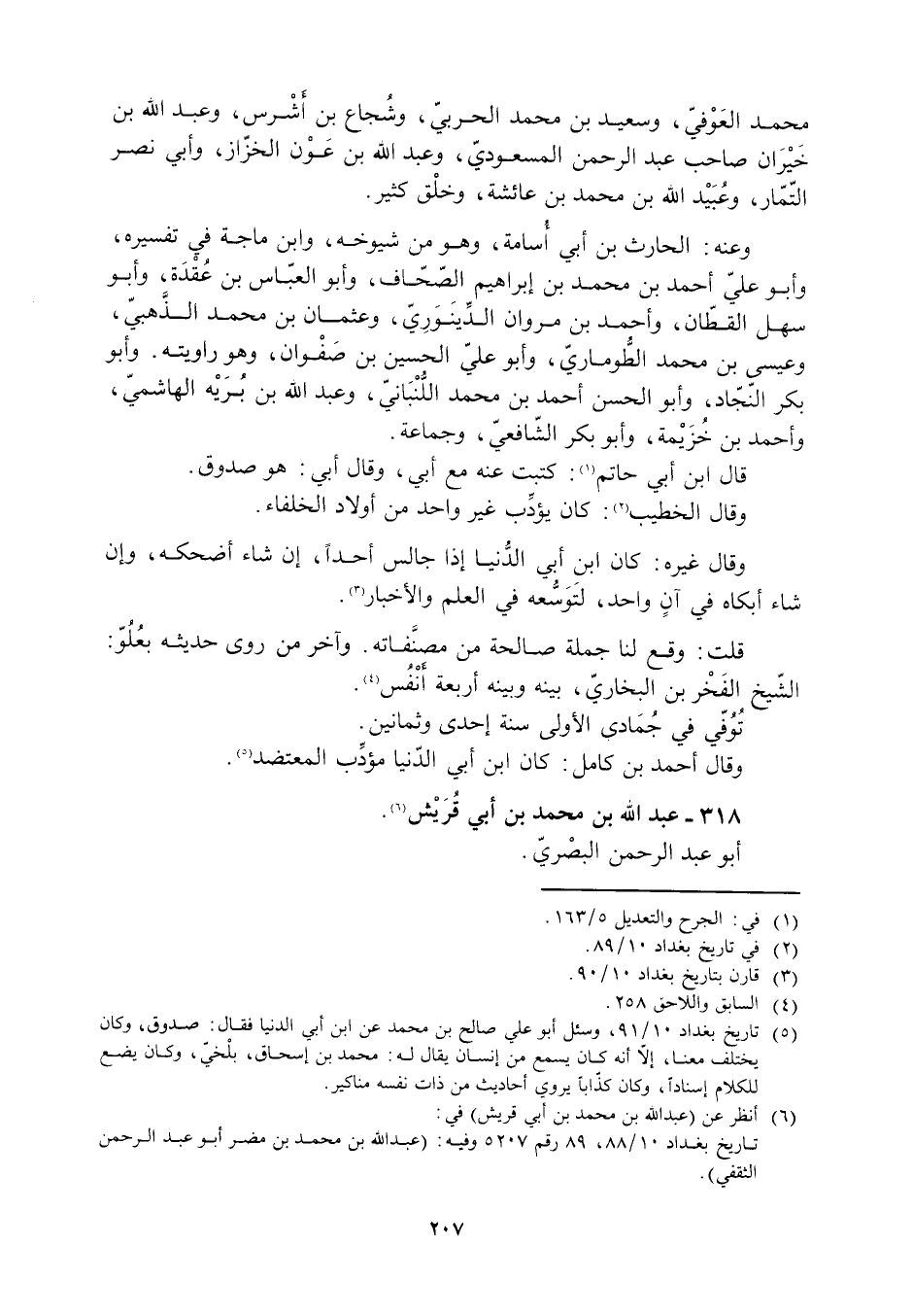 [5] تاريخ بغداد 10/ 91، وسئل أبو علي صالح بن محمد عن ابن أبي الدنيا فقال: صدوق، وكان يختلف معنا، إلّا أنه كان يسمع من إنسان يقال له: محمد بن إسحاق، بلخيّ، وكان يضع للكلام إسنادا، وكان كذّابا يروي أحاديث من ذات نفسه مناكير.