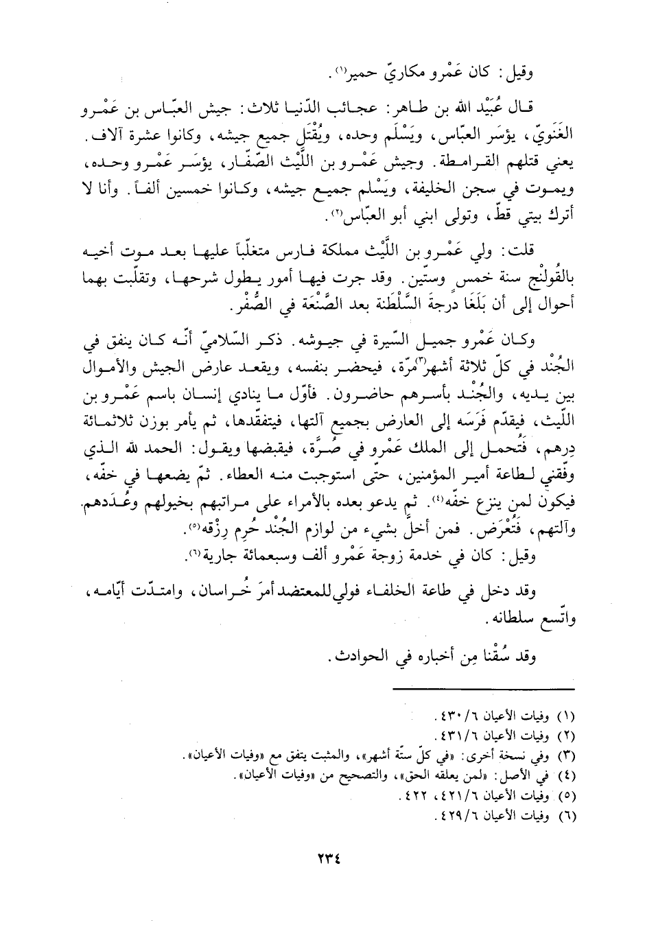قُلْتُ: ولي عَمْرو بن اللَّيْث مملكة فارس متغلبًا عليها بعد موت أخيه بالقُولنج سنة خمسٍ وستين. وقد جرت فيها أمور يطول شرحها، وتقلبت بهما أحوال إلى أن بلغَا درجةَ السَّلْطنة بعد الصَّنْعة في الصُّفْر.