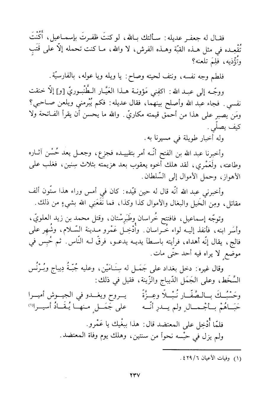 وَأَخْبَرَنَا عبد الله بن الفتح أَنَّهُ أمر بتقييده فجزع، وجعل يعد حُسن آثاره وطاعته، ولعمْري، لقد هلك أخوه يعقوب بعد هزيمته بثلاث سنين، فغلب عَلَى الأهواز، وحمل الأموال إلى السّلطان.