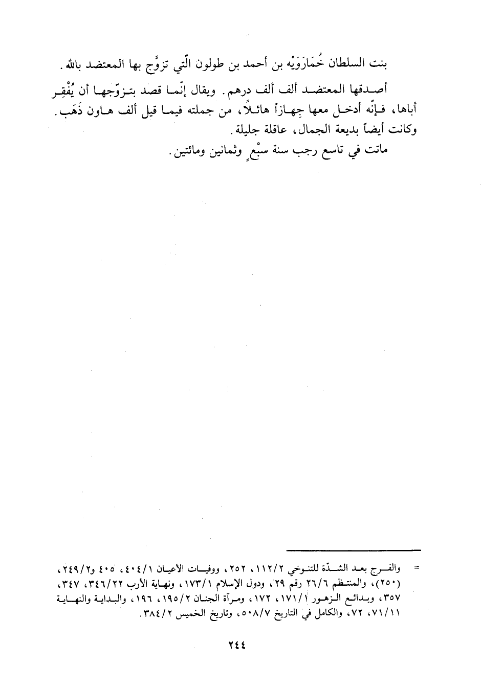 [ () ] والفرج بعد الشدّة للتنوخي 2/ 112، 252، ووفيات الأعيان 1/ 404، 405 و 2/ 249، (250) ، والمنتظم 6/ 26 رقم 29، ودول الإسلام 1/ 173، ونهاية الأرب 22/ 346، 347، 357، وبدائع الزهور 1/ 171، 172، ومرآة الجنان 2/ 195، 196، والبداية والنهاية 11/ 71، 72، والكامل في التاريخ 7/ 508، وتاريخ الخميس 2/ 384.