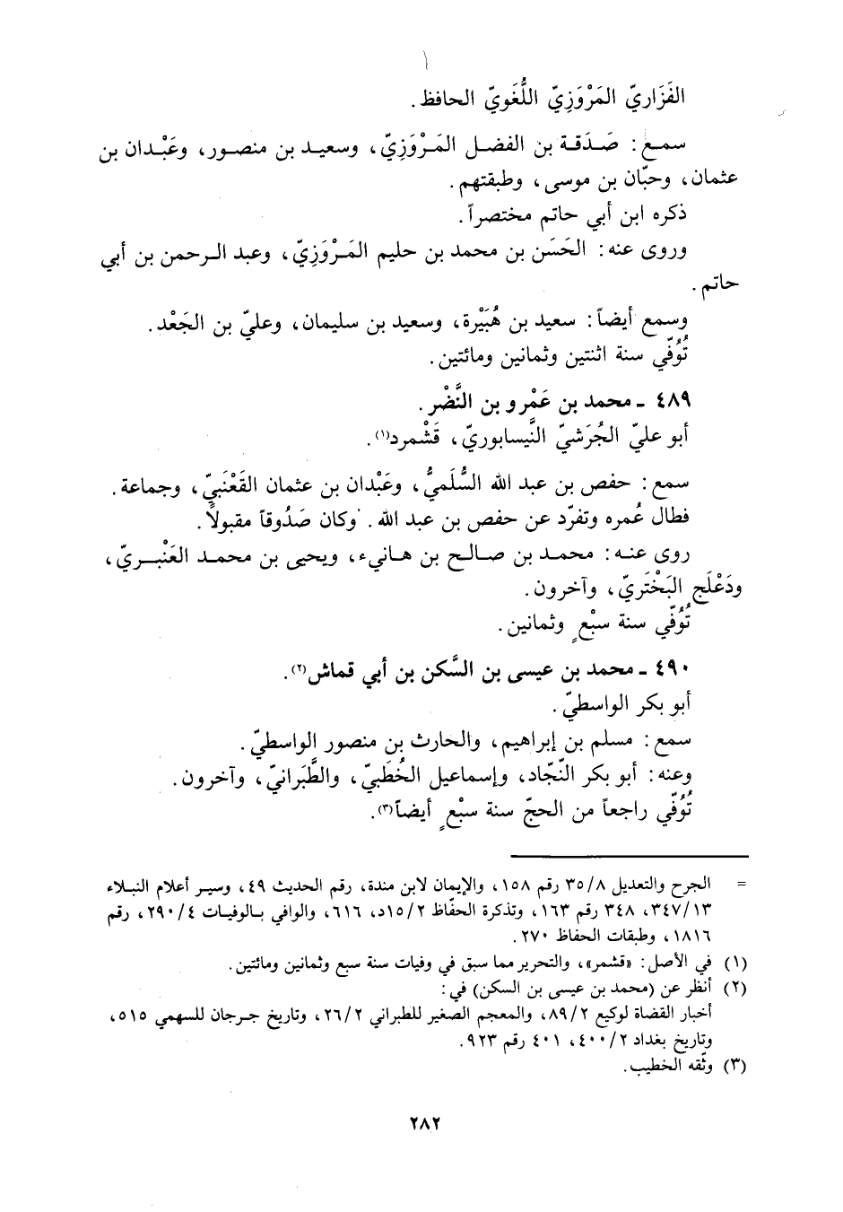 [ () ] الجرح والتعديل 8/ 35 رقم 158، والإيمان لابن مندة، رقم الحديث 49، وسير أعلام النبلاء 13/ 347، 348 رقم 163، وتذكرة الحفّاظ 2/ 15 د، 616، والوافي بالوفيات 4/ 290، رقم 1816، وطبقات الحفاظ 270.