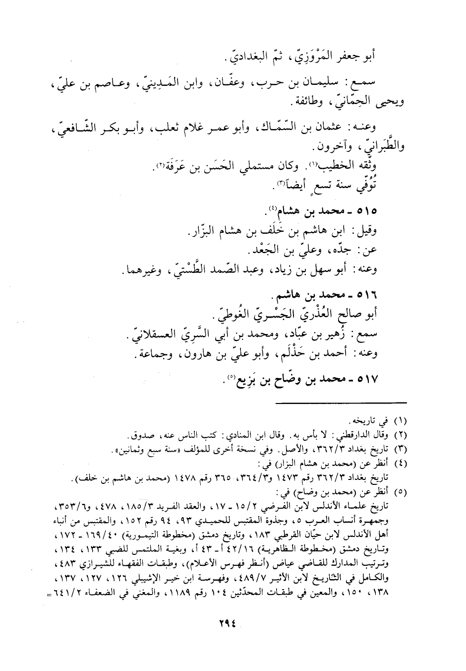 تاريخ بغداد 3/ 362 رقم 1473 و 3/ 364، 365 رقم 1478 (محمد بن هشام بن خلف) .