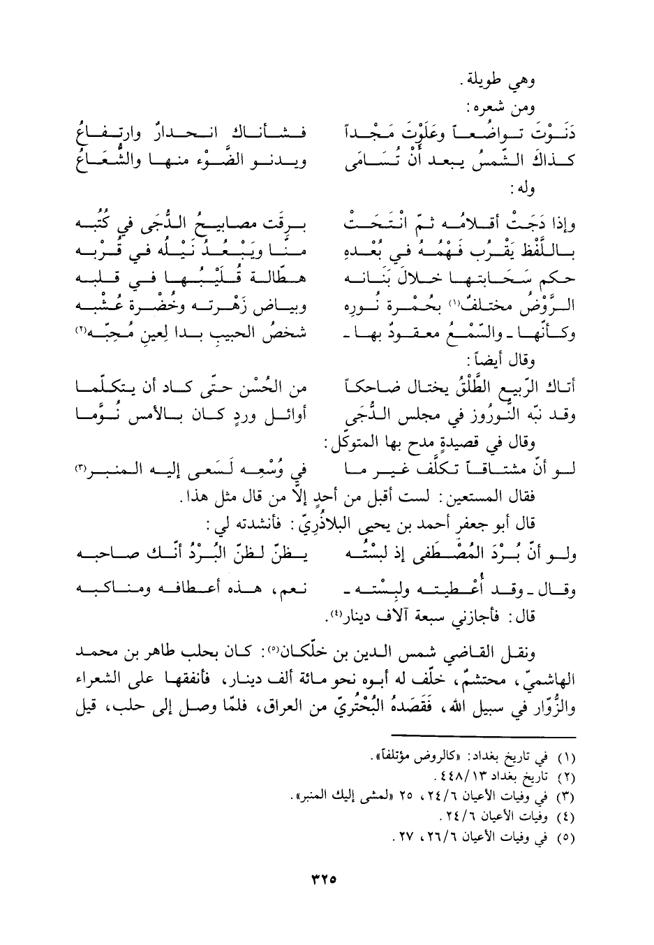 ونقل القاضي شمس الدين بن خلّكان [5] : كَانَ بحلب طاهر بن محمد الهاشميّ، محتشمٌ، خلّف لَهُ أَبُوه نحو مائة ألف دينار، فأنفقها عَلَى الشعراء والزُّوار في سبيل الله، فَقَصَدهُ البُحْتُريّ من العراق، فَلَمَّا وصل إلى حلب، قيل