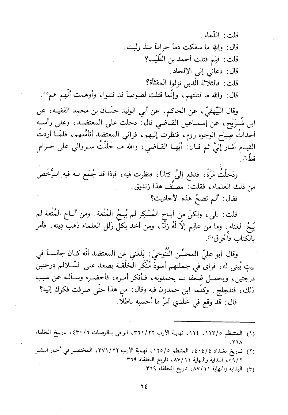 [2] تاريخ بغداد 4/ 404، المنتظم 5/ 125، نهاية الأرب 22/ 371، المختصر في أخبار البشر 2/ 59، البداية والنهاية 11/ 87، تاريخ الخلفاء 369.