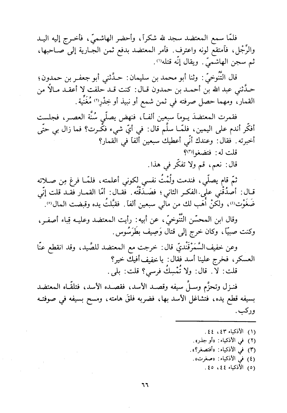 ثُمَّ قام يصلي، فندمت ولُمت نفسي لكوني أعلمته، فَلَمَّا فرغ من صلاته قَالَ: أصدقني على الفكر الثاني، فصدقته. فَقَالَ: أما القمار فقد قُلْتُ إني ضغوت [4] ، ولكن أهب لك من مالي سبعين ألفًا. فقبلت يده وقبضت المال [5] .