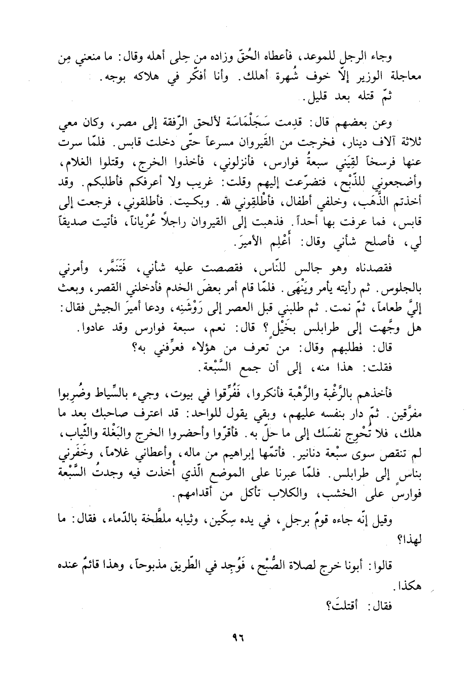 وعن بعضهم قَالَ: قدمت سجلماسة لألحق الرفقة إلى مصر، وكان معي ثلاثة ألاف دينار، فخرجت من القَيْرُوَان مسرعًا حَتَّى دخلت قابس. فَلَمَّا سرت عنها فرسخًا لقيني سبعةُ فوارس، فأنزلوني، فأخذوا الخرج، وقتلوا الغلام، وأضجعوني للذبح، فتضرعت إليهم وَقُلْتُ: غريب ولا أعرفكم فأطلبكم. وقد أخذتم الذهب، وخلفي أطفال، فأطلقوني للَّه. وبكيت. فأطلقوني، فرجعت إلى قابس، فما عرفت بها أحدا. فذهبت إلى القَيْرُوَان راجلًا عُريانًا، فأتيت صديقًا لي، فأصلح شأني وَقَالَ: أعْلِم الأمير.
