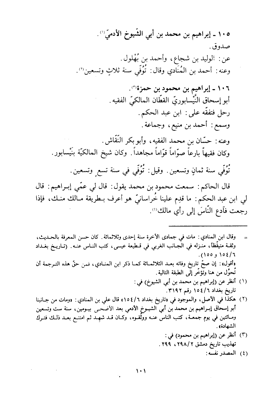 [2] هكذا في الأصل، والموجود في «تاريخ بغداد 6/ 154» قال علي بن المنادي: «ومات من جانبنا أبو إسحاق إبراهيم بن محمد بن أبي الشّيوخ الأدميّ بعد الأضحى بيومين، سنة ست وتسعين ومائتين في يوم جمعة، كتب الناس عنه ووثّقوه، وكان قد شهد ثم امتنع بعد ذلك فترك الشهادة» .