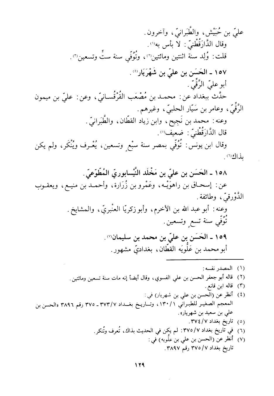 المعجم الصغير للطبراني 1/ 130، وتاريخ بغداد 7/ 373- 375 رقم 3896 «الحسن بن علي بن سعيد بن شهريار» .