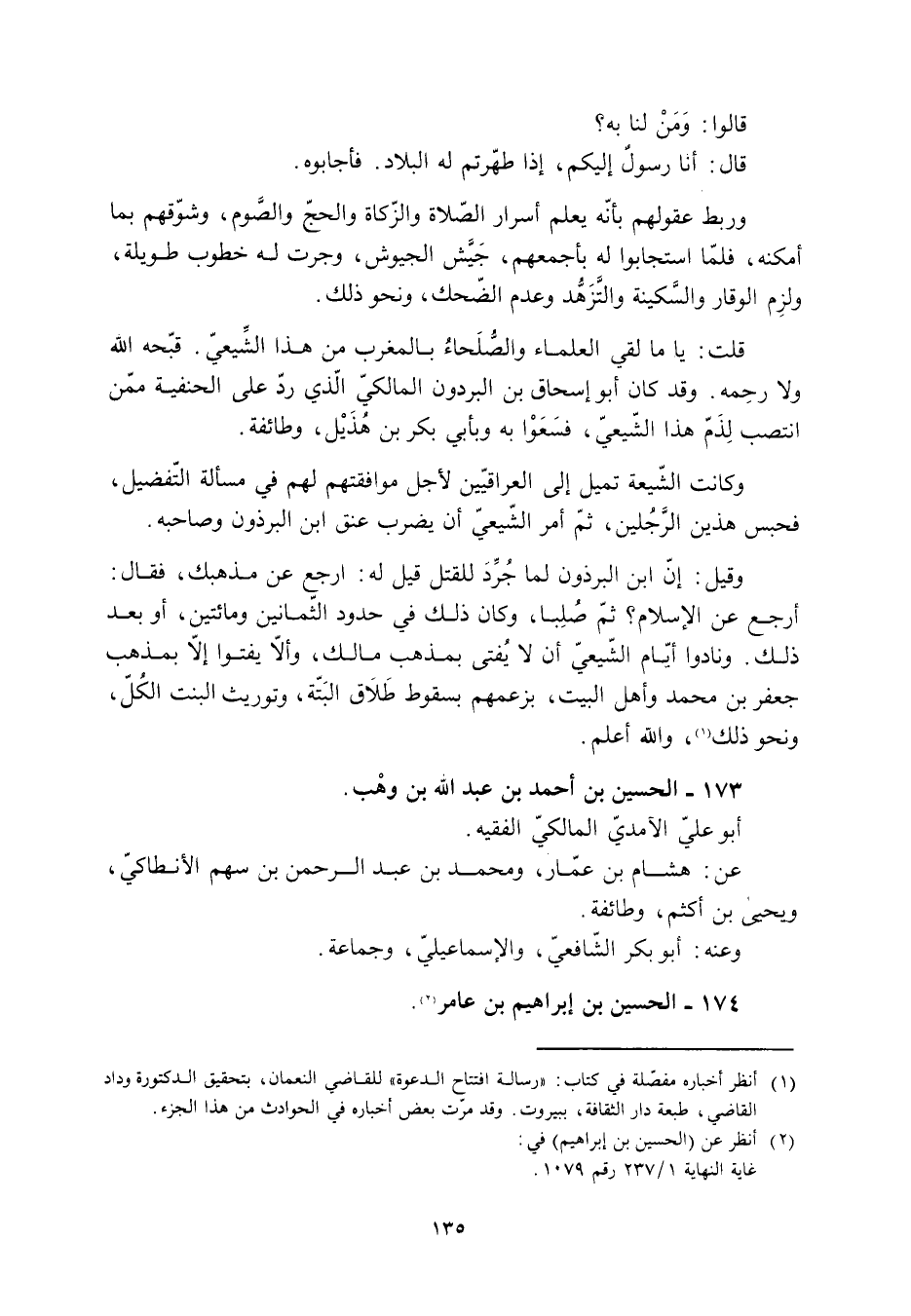 أرجع عن الإسلام؟ ثم صُلِبا، وكان ذلك في حدود الثّمانين ومائتين، أو بعد ذلك. ونادوا أيّام الشيعي أن لا يُفتى بمذهب مالك، وألّا يفتوا إلّا بمذهب جعفر بن محمد وأهل البيت، بزعمهم بسقوط طَلَاق البَتّة، وتوريث البنت الكُلّ، ونحو ذلك [1] ، والله أعلم.