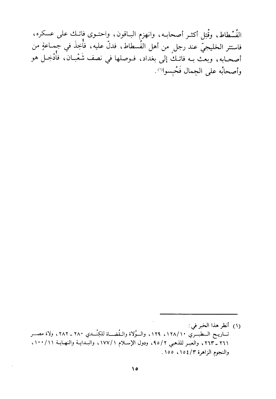 الفُسْطاط، وقُتِل أكثر أصحابه، وانهزم الباقون، واحتوى فاتك على عسكره، فاستتر الخليجيّ عند رجل من أهل الفسطاط، فدلّ عليه، فأُخِذَ في جماعةٍ من أصحابه، وبعث به فاتك إلى بغداد، فوصلها في نصف شَعْبان، فأُدْخِل هو وأصحابه على الجمال فحبسوا [1] .