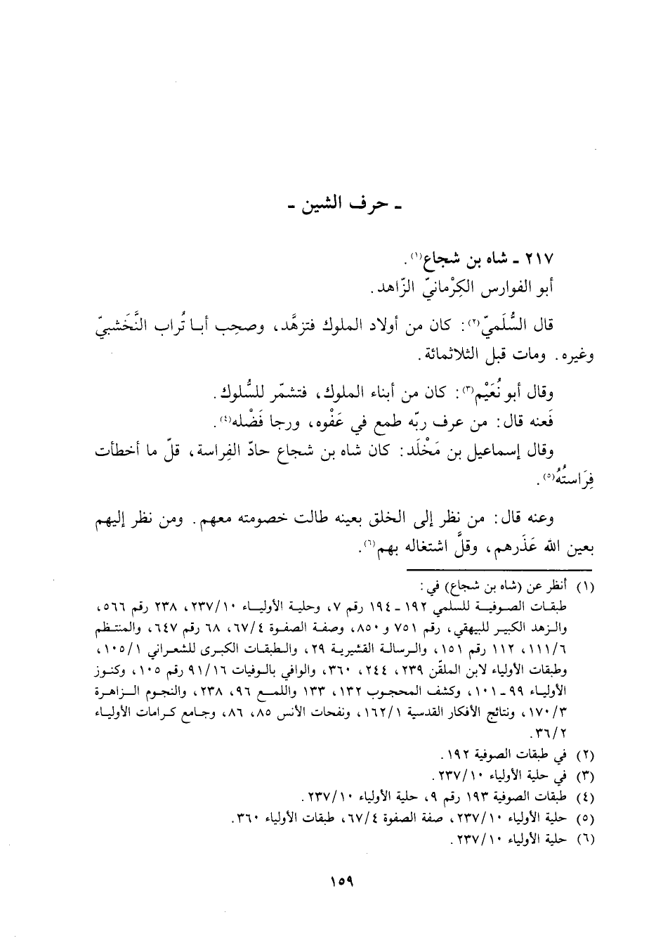 [4] طبقات الصوفية 193 رقم 9، حلية الأولياء 10/ 237.