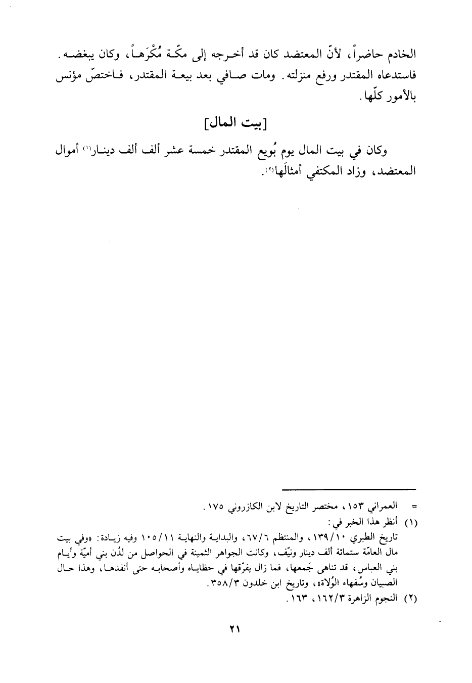وكان في بيت المال يوم بُويع المقتدر خمسة عشر ألف ألف دينار [1] أموال المعتضد، وزاد المكتفي أمثالها [2] .